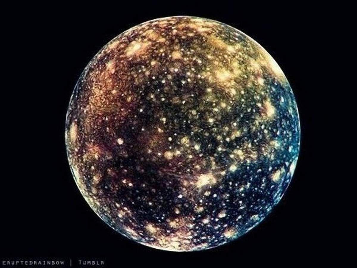 A une distance de 1,883 millions de kilomètres de Jupiter, on rencontre finalement Callisto, avec un diamètre de 4806 kilomètres. Contrairement aux autres satellites galiléens, la surface de Callisto est sombre, uniforme et complètement recouverte de cratères d’impact. Callisto, du fait de son éloignement de Jupiter, est soumis à des forces de marée plus faibles que les autres satellites galiléens et sa surface d’origine n’a donc pas été renouvelée par des processus internes.
