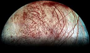 On rencontre ensuite Europe, à une distance de 670 900 kilomètres de Jupiter et avec un diamètre de 3138 kilomètres. Europe présente une surface très lisse formée de glace d’eau sans relief notable mais recouverte d’une multitude de crevasses pouvant s’étendre sur des milliers de kilomètres. Ces caractéristiques peuvent s’expliquer si, à une époque reculée, la surface a été fondue par des forces de marée avant de geler en laissant apparaître d’énormes fractures. Il est d’ailleurs possible que les mêmes forces de marée créent encore suffisamment de chaleur pour permettre l’existence d’un océan liquide sous la croûte glacée, d’où la possibilité d’une forme de vie sous la surface.