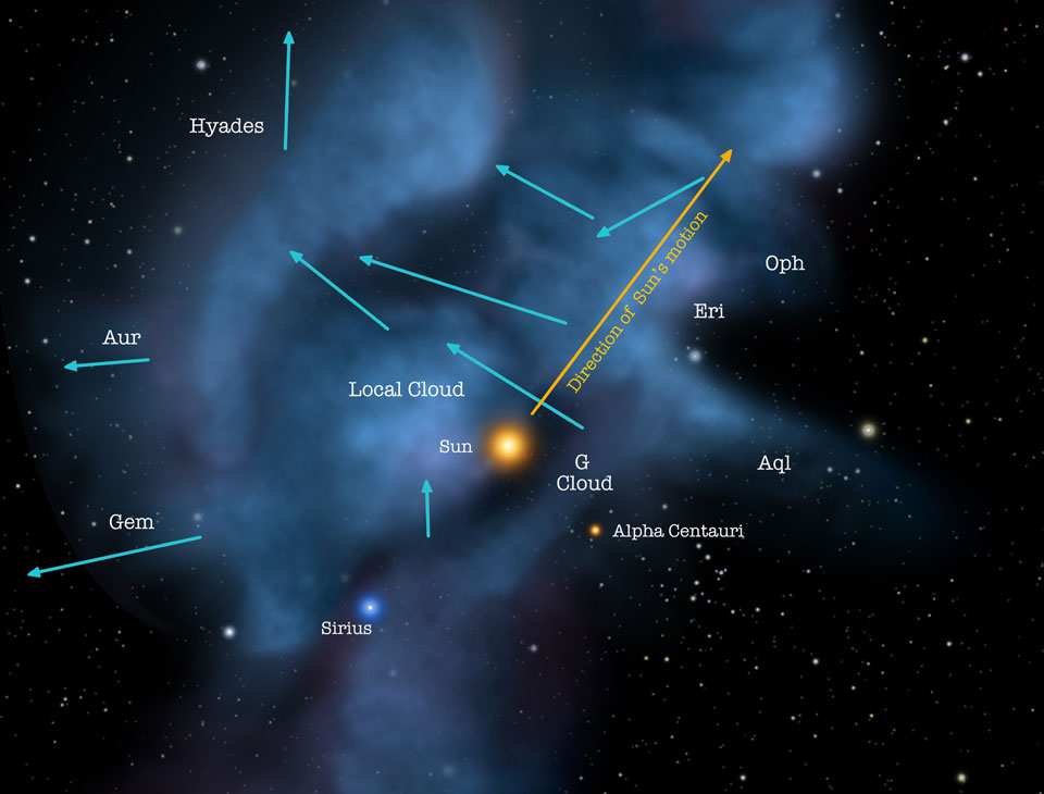 Le vide intersidéral n’est pas vide! Les scientifiques l’appellent le Milieu InterStellaire (MIS). C’est un milieu aux conditions extrêmes et qui connait au moins 5 états différents qui vont d’un milieu très ténu et très chaud (1 million de degrés) à un milieu très dense et très froid (entre -260 et -265°C, très près du zéro absolu) avec des étapes intermédiaires chaudes ou froides. Très dense, ça veut dire quoi? Ça veut dire aussi dense que les vides les plus poussés qu’on arrive à créer en laboratoire! Dans un litre d’air il y a trente mille milliards de milliards de molécules (un 3 suivi de 22 zéros). Au laboratoire, on descend à 1 milliard de molécules par litre et on appelle ça de l’ultra-vide. En fait, c’est loin d’être vide... Que contient le MIS? Ça dépend de son état. Très chaud, il est très peu dense (1 particule par litre) et les particules sont des atomes qui ont perdu un ou plusieurs électrons. On les appelle des ions. On y trouve aussi des poussières, éclairées par les étoiles voisines. Très froid, sa densité dépasse le million de particules par litre et les grains de poussière et le gaz sont présents en grande quantité. Ils sont rassemblés dans des “nuages interstellaires”. Ces nuages sont immenses. La lumière mettra plusieurs années à traverser un grand nuage (elle met 8 minutes pour nous parvenir du Soleil). Ces nuages bloquent les UV (comme l’ozone dans l’atmosphère terrestre). Alors il s’y développe plein de molécules comme l’eau, l’ammoniac et le méthanol.