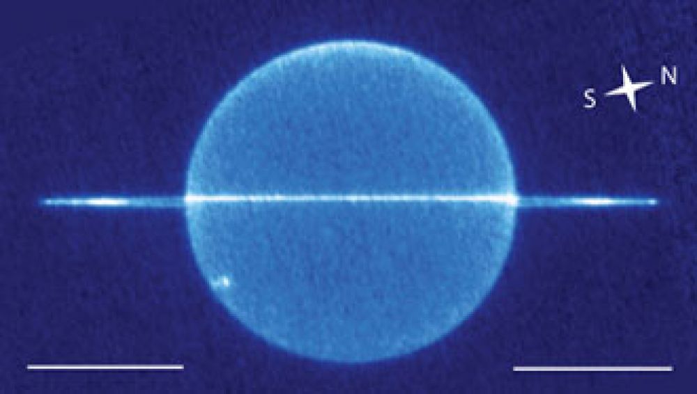 Uranus possède au moins 27 satellites, dont les cinq principaux sont, par ordre de distance croissante à la planète, Miranda, Ariel, Umbriel, Titania et Obéron. Le plus grand de ces satellites est Titania, avec un diamètre de 1580 kilomètres, soit moins de la moitié de celui de notre Lune. La planète est aussi entourée de plusieurs anneaux très fins découverts depuis la Terre lors de l’observation d’une occultation d’étoile en 1977. Leur existence a ensuite été confirmée lors du survol par la sonde Voyager 2 et d’autres anneaux ont encore été découverts plus tard, en particulier par le télescope spatial Hubble. Ces anneaux sont formés de boules de glace sombre et peu réfléchissante, les plus grosses pouvant atteindre quelques mètres de diamètre.